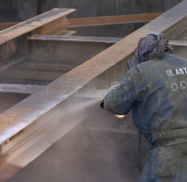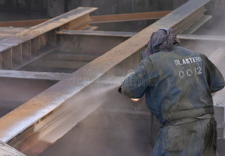 Sandblasting dilakukan untuk mengikis lapisan di permukaan logam dan baja. Media abrasif yang digunakan adalah pasir silika karena tidak mudah pecah dan memiliki pinggiran yang tajam.